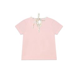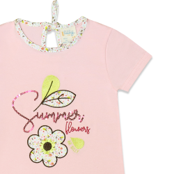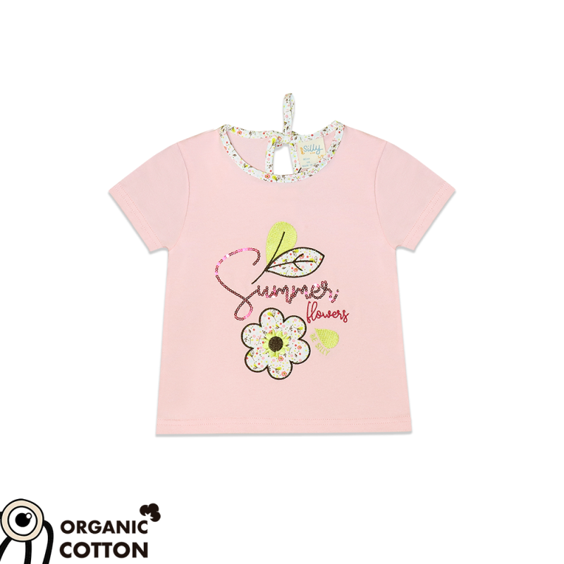 T-shirt em algodão orgânico com bordado na frente e detalhe florido na gola.